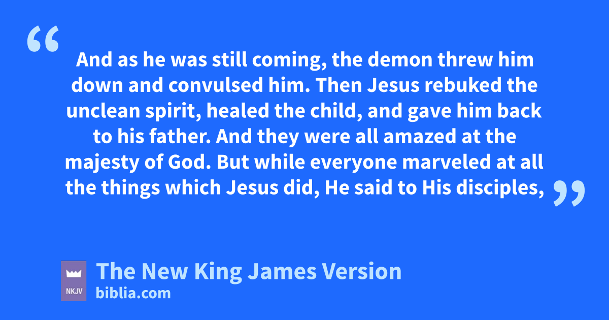 37 hNow it happened on the next day, when they had come down from the mountain, that a great multitude met Him. 38 Suddenly a man from the multitude cried out, saying, “Teacher, I implore You, look on my son, for he is my only child. 39 And behold, a spirit seizes him, and he suddenly cries out; it convulses him so that he foams at the mouth; and it departs from him with great difficulty, bruising him. 40 So I implored Your disciples to cast it out, but they could not.”