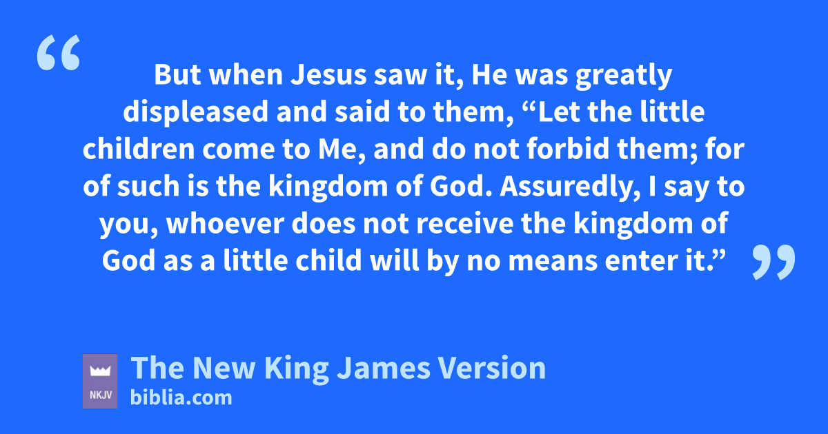 13 gThen they brought little children to Him, that He might touch them; but the disciples rebuked those who brought them. 14 But when Jesus saw it, He was greatly displeased and said to them, “Let the little children come to Me, and do not forbid them; for hof such is the kingdom of God. 15 Assuredly, I say to you, iwhoever does not receive the kingdom of God as a little child will jby no means enter it.” 16 And He took them up in His arms, laid His hands on them, and blessed them.