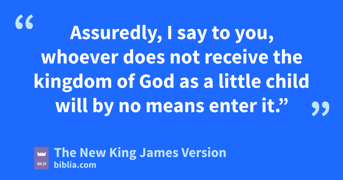 13 gThen they brought little children to Him, that He might touch them; but the disciples rebuked those who brought them. 14 But when Jesus saw it, He was greatly displeased and said to them, “Let the little children come to Me, and do not forbid them; for hof such is the kingdom of God. 15 Assuredly, I say to you, iwhoever does not receive the kingdom of God as a little child will jby no means enter it.” 16 And He took them up in His arms, laid His hands on them, and blessed them.