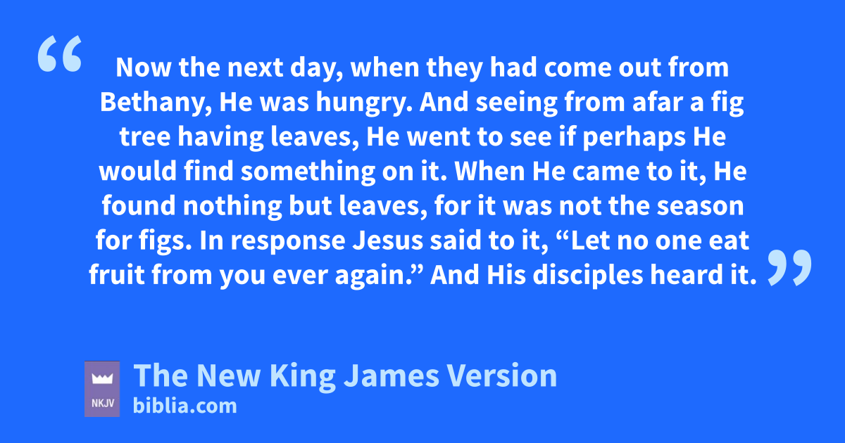 12 fNow the next day, when they had come out from Bethany, He was hungry. 13 gAnd seeing from afar a fig tree having leaves, He went to see if perhaps He would find something on it. When He came to it, He found nothing but leaves, for it was not the season for figs. 14 In response Jesus said to it, “Let no one eat fruit from you ever again.”
