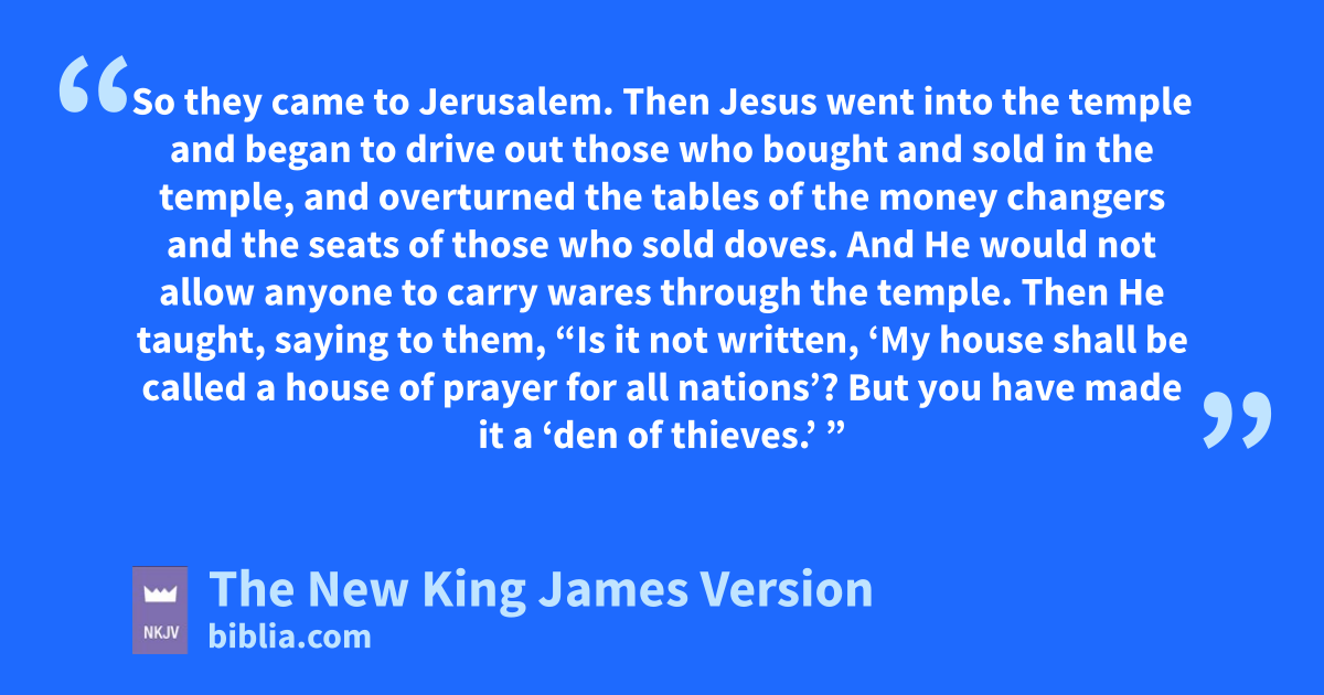 15 hSo they came to Jerusalem. Then Jesus went into the temple and began to drive out those who bought and sold in the temple, and overturned the tables of the money changers and the seats of those who sold idoves. 16 And He would not allow anyone to carry wares through the temple. 17 Then He taught, saying to them, “Is it not written, j‘My house shall be called a house of prayer for all nations’? But you have made it a k‘den of thieves.’ ”