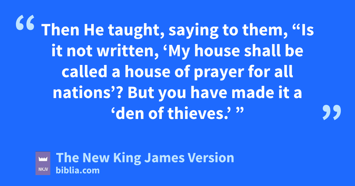 15 hSo they came to Jerusalem. Then Jesus went into the temple and began to drive out those who bought and sold in the temple, and overturned the tables of the money changers and the seats of those who sold idoves. 16 And He would not allow anyone to carry wares through the temple. 17 Then He taught, saying to them, “Is it not written, j‘My house shall be called a house of prayer for all nations’? But you have made it a k‘den of thieves.’ ”