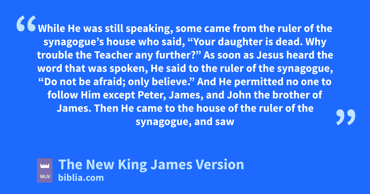 36 As soon as Jesus heard the word that was spoken, He said to the ruler of the synagogue, “Do not be afraid; only wbelieve.” 37 And He permitted no one to follow Him except Peter, James, and John the brother of James. 38 Then He came to the house of the ruler of the synagogue, and saw 7a tumult and those who xwept and wailed loudly. 39 When He came in, He said to them, “Why make this commotion and weep? The child is not dead, but ysleeping.”