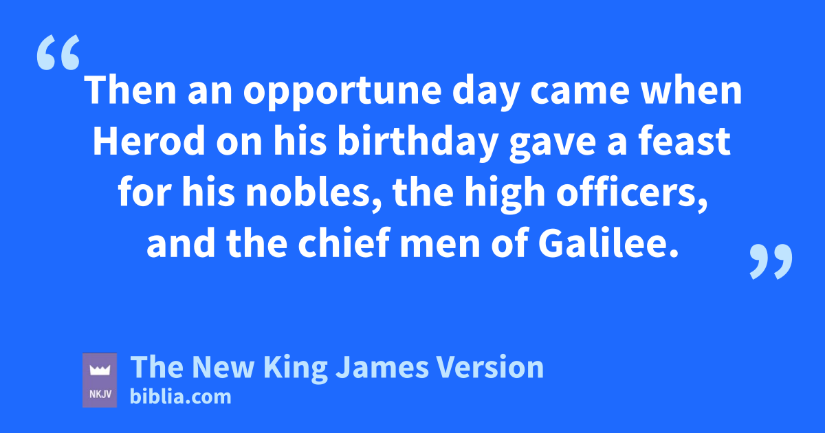 21 xThen an opportune day came when Herod yon his birthday gave a feast for his nobles, the high officers, and the chief men of Galilee. 22 And when Herodias’ daughter herself came in and danced, and pleased Herod and those who sat with him, the king said to the girl, “Ask me whatever you want, and I will give it to you.” 23 He also swore to her, z“Whatever you ask me, I will give you, up to half my kingdom.”