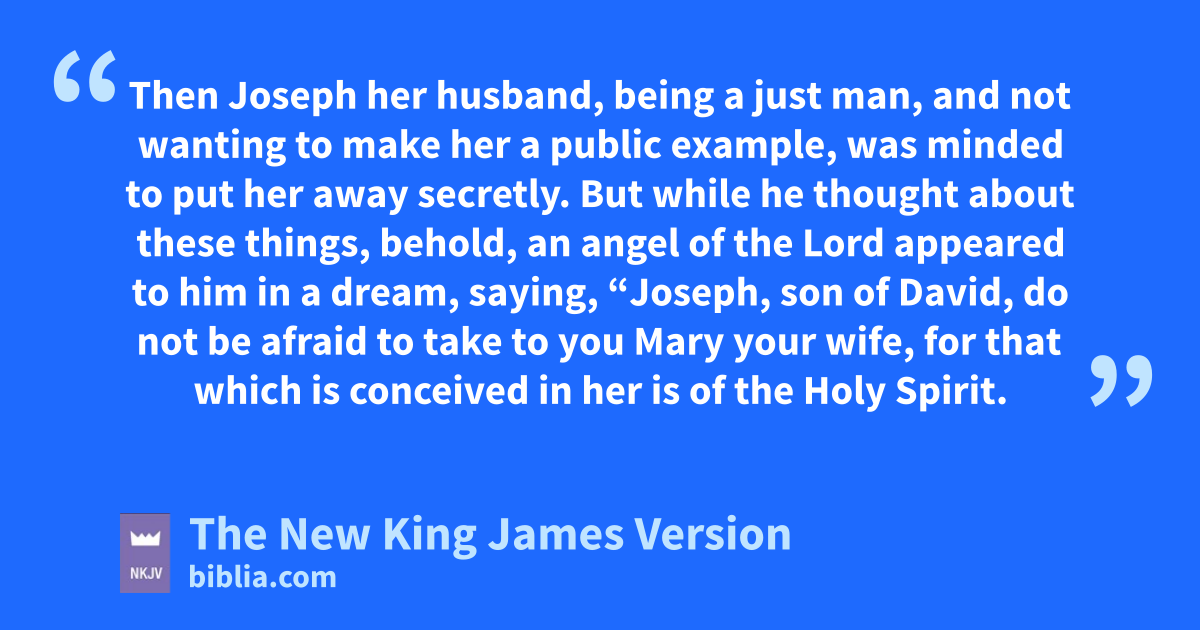 18 Now the xbirth of Jesus Christ was as follows: After His mother Mary was betrothed to Joseph, before they came together, she was found with child yof the Holy Spirit. 19 Then Joseph her husband, being 6a just man, and not wanting zto make her a public example, was minded to put her away secretly. 20 But while he thought about these things, behold, an angel of the Lord appeared to him in a dream, saying, “Joseph, son of David, do not be afraid to take to you Mary your wife, afor that which is 7conceived in her is of the Holy Spirit. 21 bAnd she will bring forth a Son, and you shall call His name 8Jesus, cfor He will save His people from their sins.”