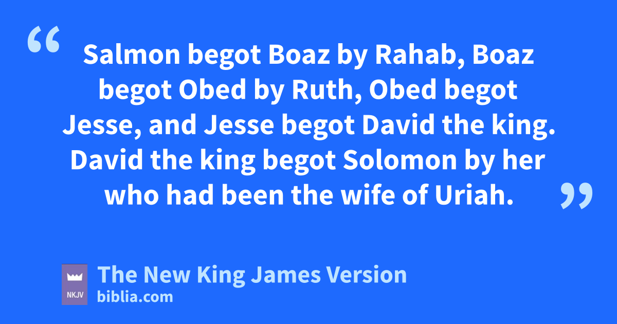 2 dAbraham begot Isaac, eIsaac begot Jacob, and Jacob begot fJudah and his brothers. 3 gJudah begot Perez and Zerah by Tamar, hPerez begot Hezron, and Hezron begot Ram. 4 Ram begot Amminadab, Amminadab begot Nahshon, and Nahshon begot Salmon. 5 Salmon begot iBoaz by Rahab, Boaz begot Obed by Ruth, Obed begot Jesse, 6 and jJesse begot David the king.