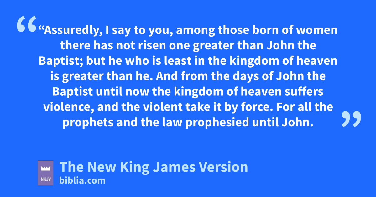 11 “Assuredly, I say to you, among those born of women there has not risen one greater than John the Baptist; but he who is least in the kingdom of heaven is greater than he. 12 lAnd from the days of John the Baptist until now the kingdom of heaven suffers violence, and the violent take it by force. 13 mFor all the prophets and the law prophesied until John. 14 And if you are willing to receive it, he is nElijah who is to come. 15 oHe who has ears to hear, let him hear!