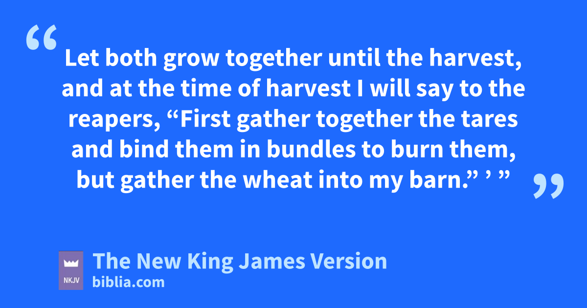 24 Another parable He put forth to them, saying: “The kingdom of heaven is like a man who sowed good seed in his field; 25 but while men slept, his enemy came and sowed tares among the wheat and went his way. 26 But when the grain had sprouted and produced a crop, then the tares also appeared. 27 So the servants of the owner came and said to him, ‘Sir, did you not sow good seed in your field? How then does it have tares?’ 28 He said to them, ‘An enemy has done this.’ The servants said to him, ‘Do you want us then to go and gather them up?’ 29 But he said, ‘No, lest while you gather up the tares you also uproot the wheat with them. 30 Let both grow together until the harvest, and at the time of harvest I will say to the reapers, “First gather together the tares and bind them in bundles to burn them, but xgather the wheat into my barn.” ’ ”
