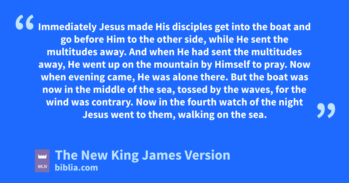22 Immediately Jesus 1made His disciples get into the boat and go before Him to the other side, while He sent the multitudes away. 23 iAnd when He had sent the multitudes away, He went up on the mountain by Himself to pray. jNow when evening came, He was alone there. 24 But the boat was now 2in the middle of the sea, tossed by the waves, for the wind was contrary.