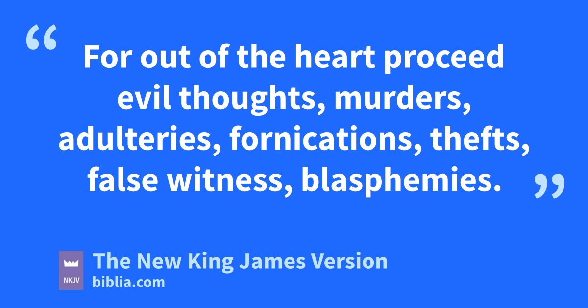 16 So Jesus said, n“Are you also still without understanding? 17 Do you not yet understand that owhatever enters the mouth goes into the stomach and is eliminated? 18 But pthose things which proceed out of the mouth come from the heart, and they defile a man. 19 qFor out of the heart proceed evil thoughts, murders, adulteries, fornications, thefts, false witness, blasphemies. 20 These are the things which defile a man, but to eat with unwashed hands does not defile a man.”