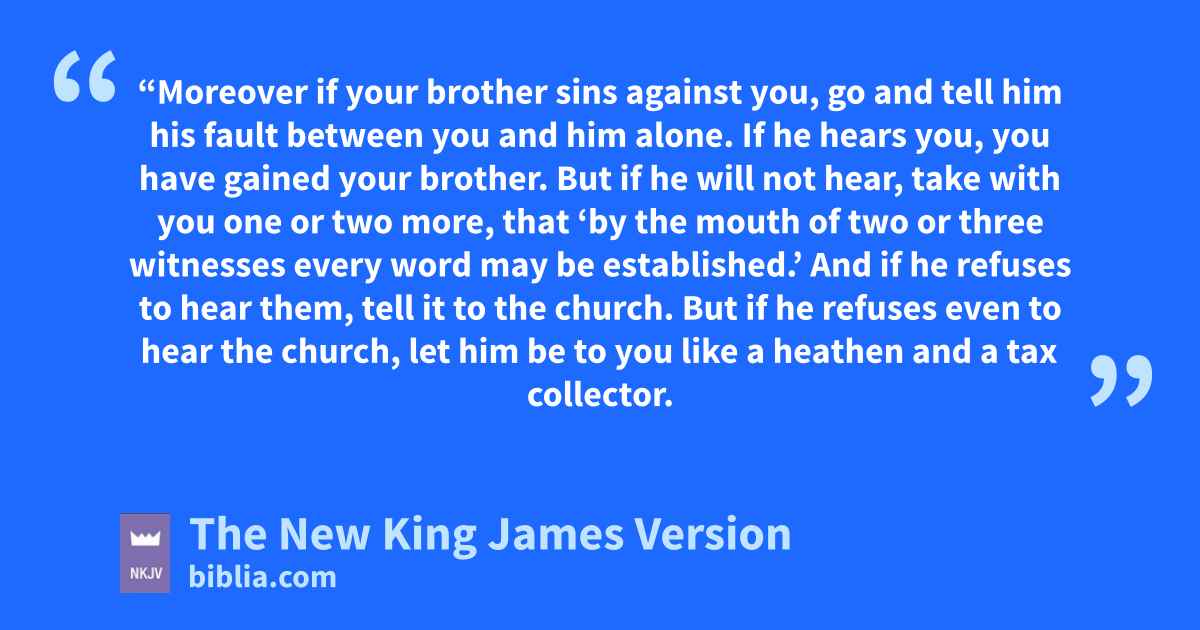 15 “Moreover oif your brother sins against you, go and tell him his fault between you and him alone. If he hears you, pyou have gained your brother. 16 But if he will not hear, take with you one or two more, that q‘by the mouth of two or three witnesses every word may be established.’ 17 And if he refuses to hear them, tell it to the church. But if he refuses even to hear the church, let him be to you like a rheathen and a tax collector.