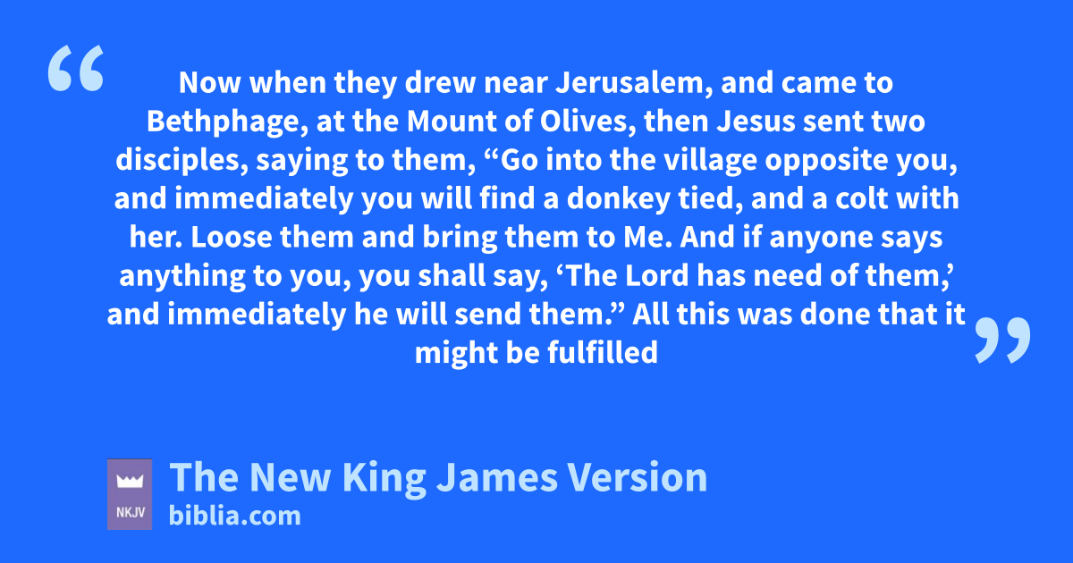 21 Now awhen they drew near Jerusalem, and came to 1Bethphage, at bthe Mount of Olives, then Jesus sent two disciples, 2 saying to them, “Go into the village opposite you, and immediately you will find a donkey tied, and a colt with her. Loose them and bring them to Me. 3 And if anyone says anything to you, you shall say, ‘The Lord has need of them,’ and immediately he will send them.”
