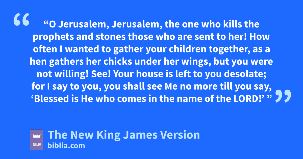 37 f“O Jerusalem, Jerusalem, the one who kills the prophets gand stones those who are sent to her! How often hI wanted to gather your children together, as a hen gathers her chicks iunder her wings, but you were not willing! 38 See! Your house is left to you desolate; 39 for I say to you, you shall see Me no more till you say, j‘Blessed is He who comes in the name of the Lord!’ ”