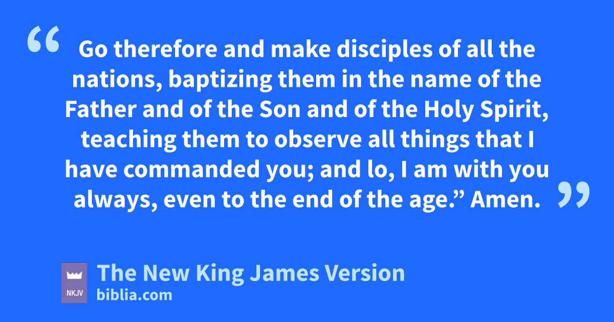 18 And Jesus came and spoke to them, saying, l“All authority has been given to Me in heaven and on earth. 19 mGo 3therefore and nmake disciples of all the nations, baptizing them in the name of the Father and of the Son and of the Holy Spirit, 20 oteaching them to observe all things that I have commanded you; and lo, I am pwith you always, even to the end of the age.” 4Amen.