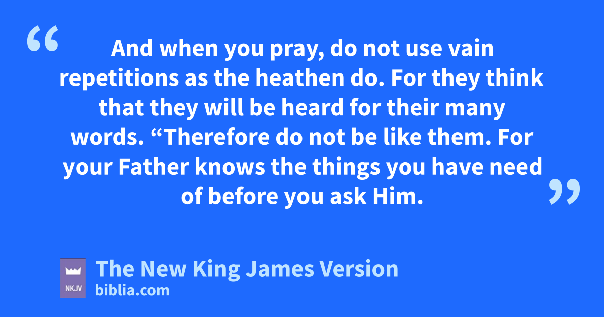 5 “And when you pray, you shall not be like the 2hypocrites. For they love to pray standing in the synagogues and on the corners of the streets, that they may be seen by men. Assuredly, I say to you, they have their reward. 6 But you, when you pray, cgo into your room, and when you have shut your door, pray to your Father who is in the secret place; and your Father who sees in secret will reward you 3openly. 7 And when you pray, ddo not use vain repetitions as the heathen do. eFor they think that they will be heard for their many words.