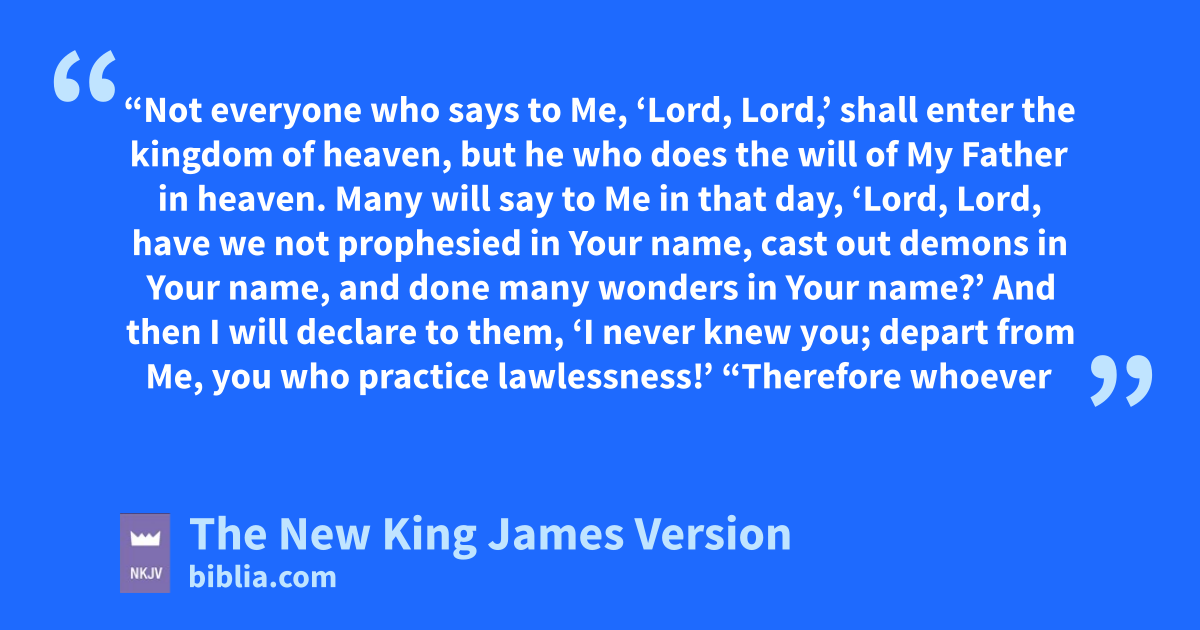 21 “Not everyone who says to Me, r‘Lord, Lord,’ shall enter the kingdom of heaven, but he who sdoes the will of My Father in heaven. 22 Many will say to Me in that day, ‘Lord, Lord, have we tnot prophesied in Your name, cast out demons in Your name, and done many wonders in Your name?’ 23 And uthen I will declare to them, ‘I never knew you; vdepart from Me, you who practice lawlessness!’