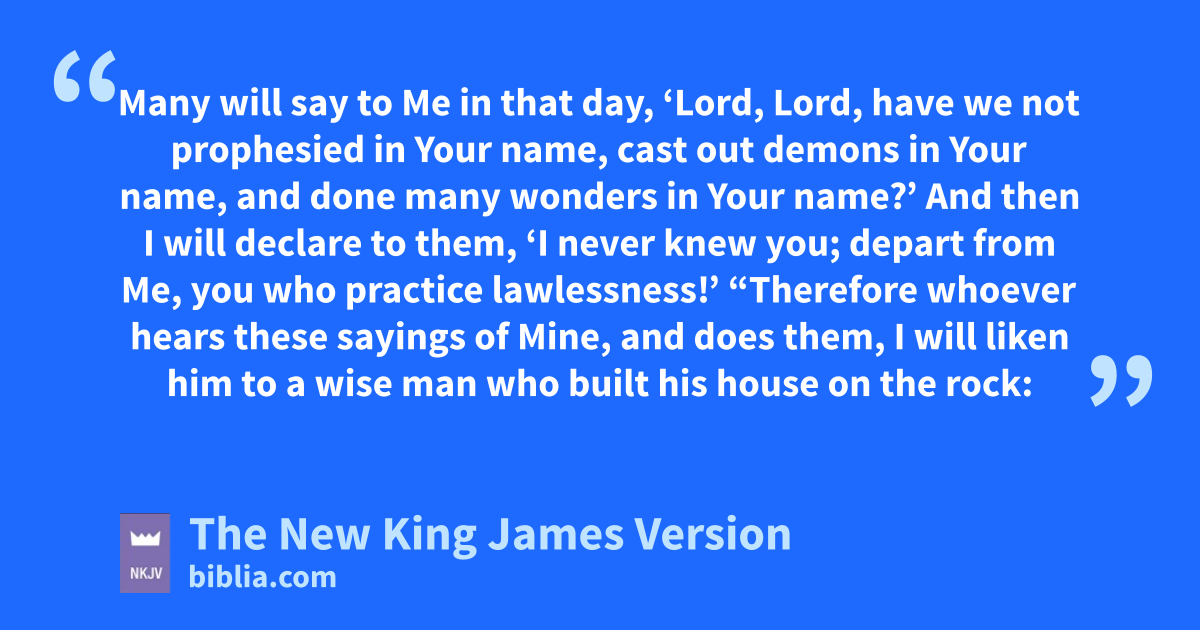 21 “Not everyone who says to Me, r‘Lord, Lord,’ shall enter the kingdom of heaven, but he who sdoes the will of My Father in heaven. 22 Many will say to Me in that day, ‘Lord, Lord, have we tnot prophesied in Your name, cast out demons in Your name, and done many wonders in Your name?’ 23 And uthen I will declare to them, ‘I never knew you; vdepart from Me, you who practice lawlessness!’