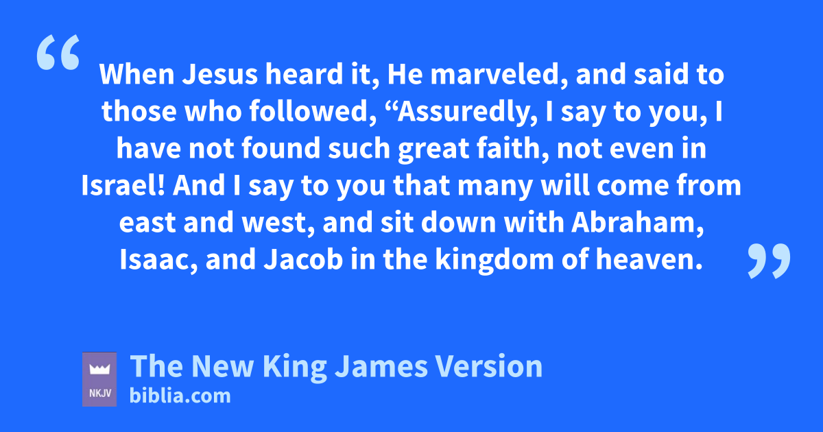 10 When Jesus heard it, He marveled, and said to those who followed, “Assuredly, I say to you, I have not found such great faith, not even in Israel! 11 And I say to you that kmany will come from east and west, and sit down with Abraham, Isaac, and Jacob in the kingdom of heaven. 12 But lthe sons of the kingdom mwill be cast out into outer darkness. There will be weeping and gnashing of teeth.” 13 Then Jesus said to the centurion, “Go your way; and as you have believed, so let it be done for you.” And his servant was healed that same hour.