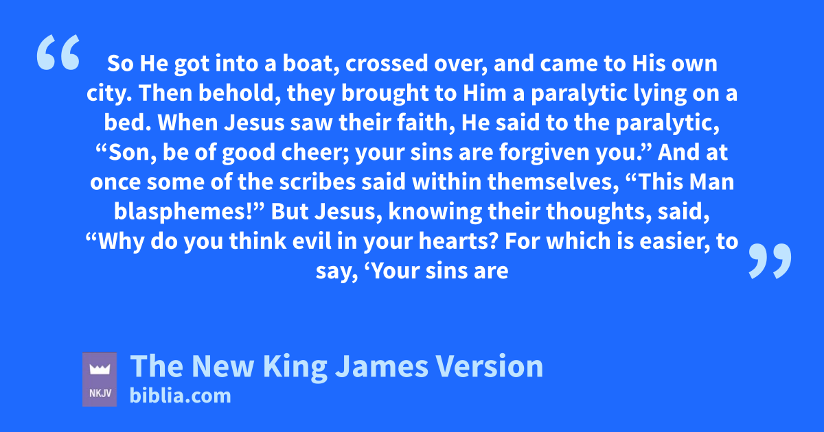 9 So He got into a boat, crossed over, aand came to His own city. 2 bThen behold, they brought to Him a paralytic lying on a bed. cWhen Jesus saw their faith, He said to the paralytic, “Son, be of good cheer; your sins are forgiven you.”