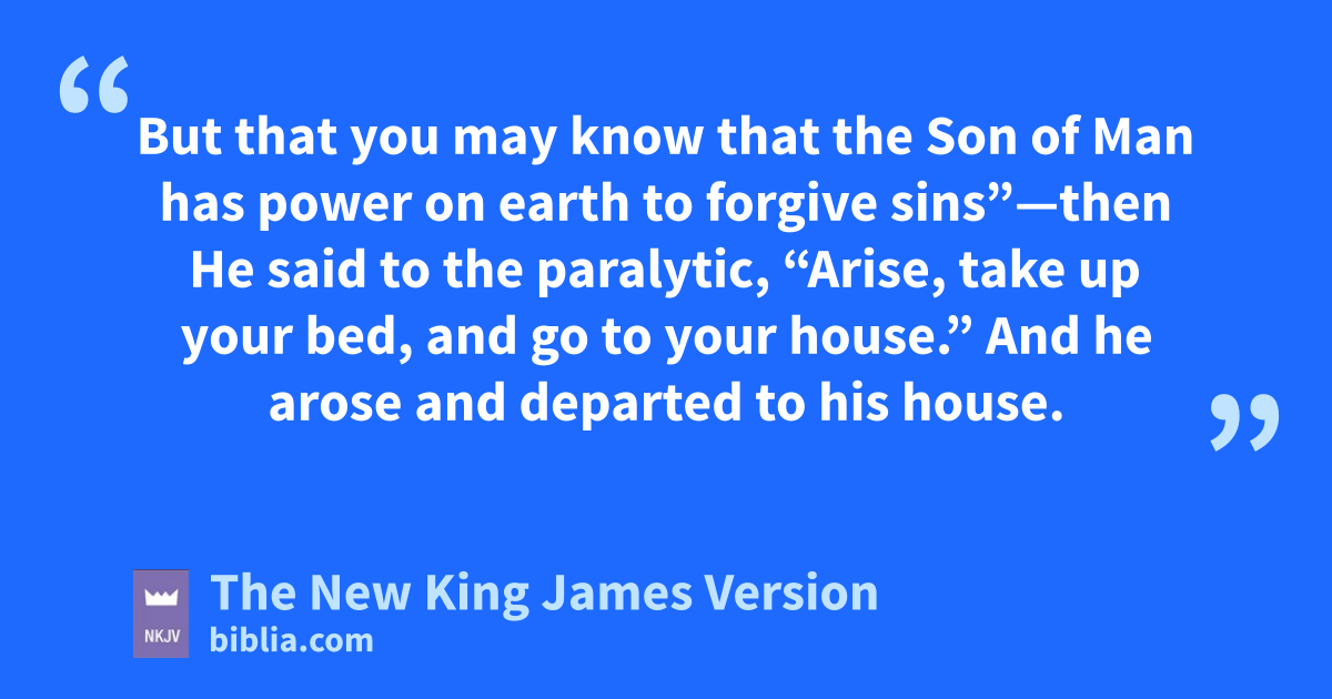 4 But Jesus, dknowing their thoughts, said, “Why do you think evil in your hearts? 5 For which is easier, to say, ‘Your sins are forgiven you,’ or to say, ‘Arise and walk’? 6 But that you may know that the Son of Man has power on earth to forgive sins”—then He said to the paralytic, “Arise, take up your bed, and go to your house.” 7 And he arose and departed to his house.