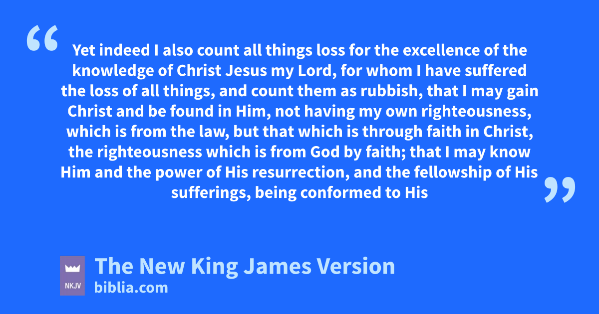 7 But mwhat things were gain to me, these I have counted loss for Christ. 8 Yet indeed I also count all things loss nfor the excellence of the knowledge of Christ Jesus my Lord, for whom I have suffered the loss of all things, and count them as rubbish, that I may gain Christ 9 and be found in Him, not having omy own righteousness, which is from the law, but pthat which is through faith in Christ, the righteousness which is from God by faith; 10 that I may know Him and the qpower of His resurrection, and rthe fellowship of His sufferings, being conformed to His death, 11 if, by any means, I may sattain 2to the resurrection from the dead.