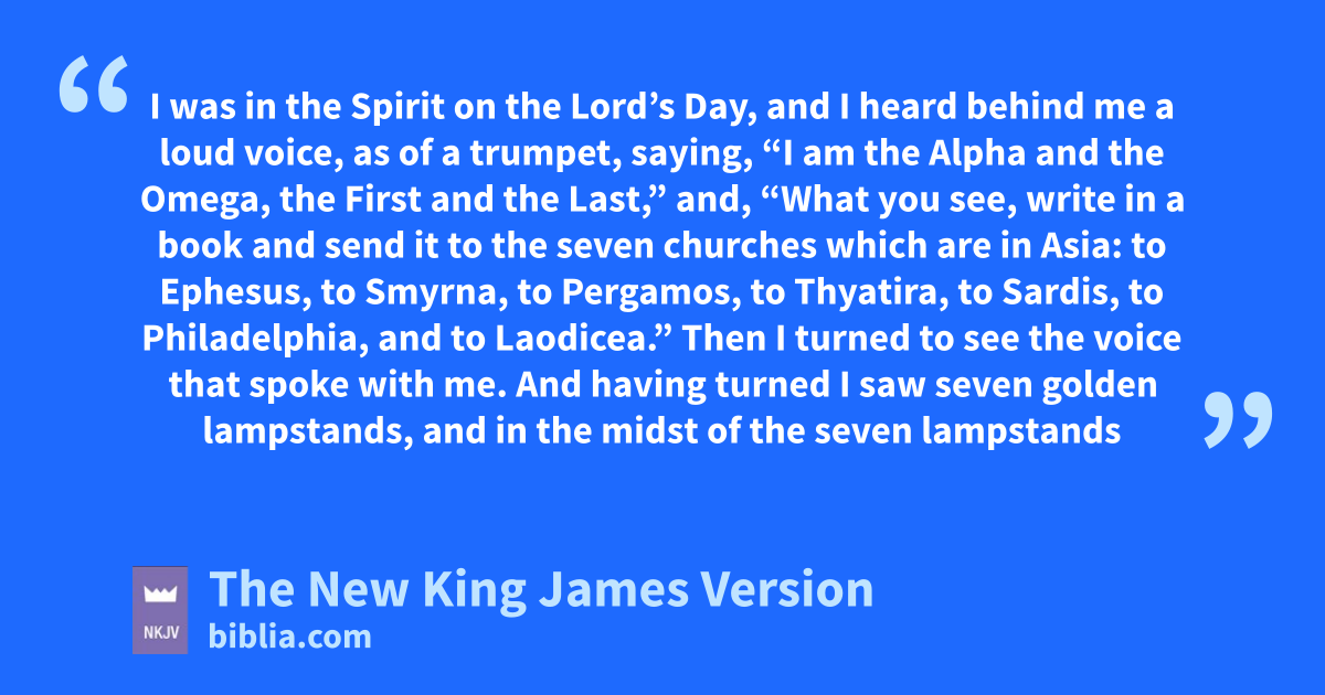 9 I, John, 6both your brother and wcompanion in the tribulation and xkingdom and patience of Jesus Christ, was on the island that is called Patmos for the word of God and for the testimony of Jesus Christ. 10 yI was in the Spirit on zthe Lord’s Day, and I heard behind me aa loud voice, as of a trumpet, 11 saying, 7“I am the Alpha and the Omega, the First and the Last,” and, “What you see, write in a book and send it to the seven churches 8which are in Asia: to Ephesus, to Smyrna, to Pergamos, to Thyatira, to Sardis, to Philadelphia, and to Laodicea.”
