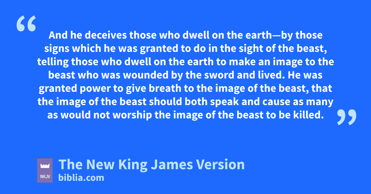 11 Then I saw another beast scoming up out of the earth, and he had two horns like a lamb and spoke like a dragon. 12 And he exercises all the authority of the first beast in his presence, and causes the earth and those who dwell in it to worship the first beast, twhose deadly wound was healed. 13 uHe performs great signs, vso that he even makes fire come down from heaven on the earth in the sight of men. 14 wAnd he deceives 6those who dwell on the earth—xby those signs which he was granted to do in the sight of the beast, telling those who dwell on the earth to make an image to the beast who was wounded by the sword yand lived. 15 He was granted power to give breath to the image of the beast, that the image of the beast should both speak zand cause as many as would not worship the image of the beast to be killed. 16 He causes all, both small and great, rich and poor, free and slave, ato receive a mark on their right hand or on their foreheads, 17 and that no one may buy or sell except one who has 7the mark or bthe name of the beast, cor the number of his name.