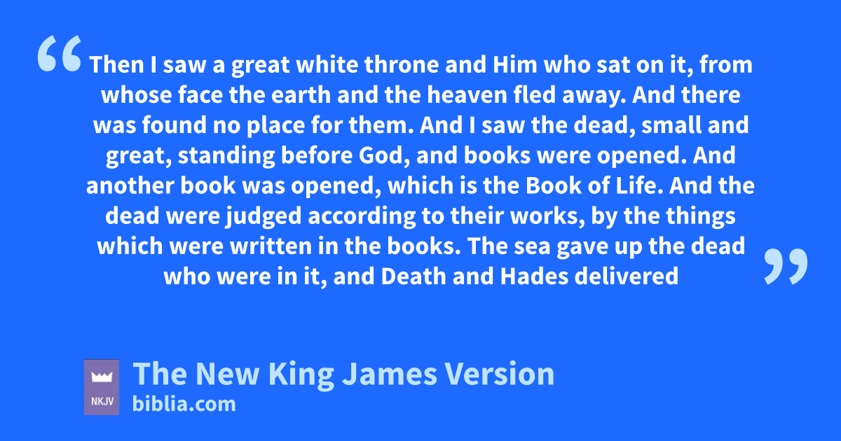 11 Then I saw a great white throne and Him who sat on it, from whose face uthe earth and the heaven fled away. vAnd there was found no place for them. 12 And I saw the dead, wsmall and great, standing before 3God, xand books were opened. And another ybook was opened, which is the Book of Life. And the dead were judged zaccording to their works, by the things which were written in the books. 13 The sea gave up the dead who were in it, aand Death and Hades delivered up the dead who were in them. bAnd they were judged, each one according to his works. 14 Then cDeath and Hades were cast into the lake of fire. dThis is the second 4death. 15 And anyone not found written in the Book of Life ewas cast into the lake of fire.