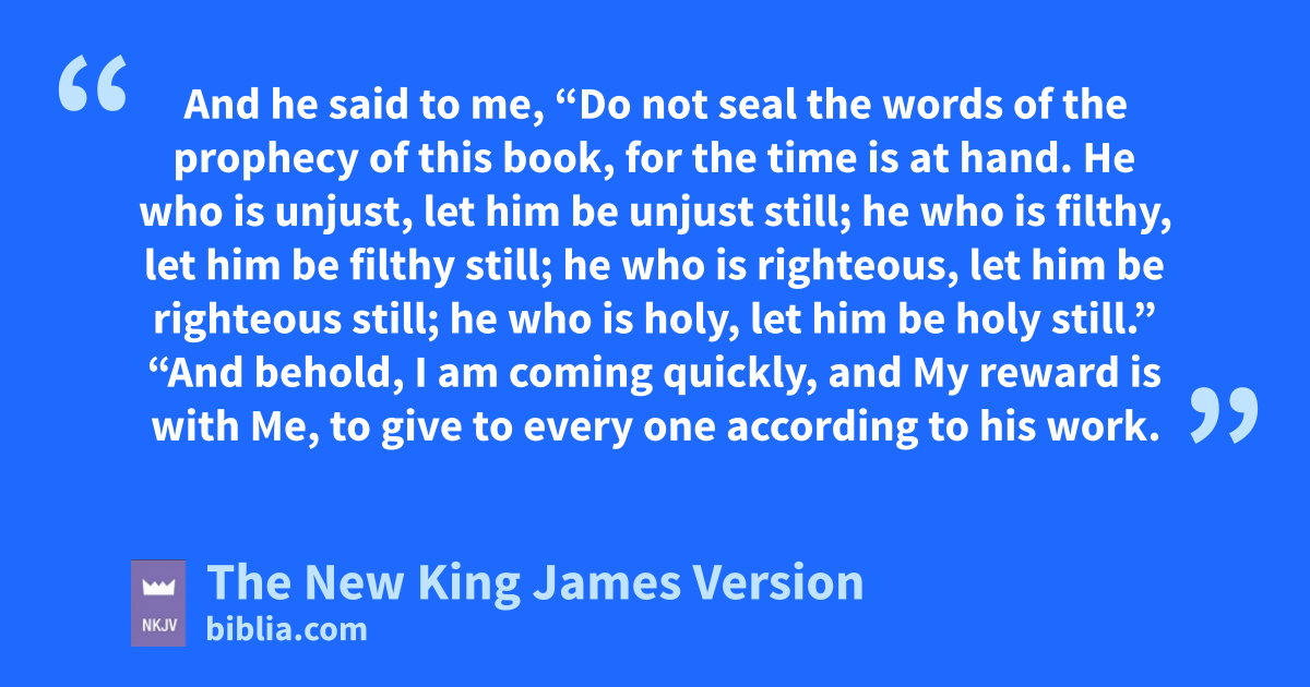 9 Then he said to me, t“See that you do not do that. 4For I am your fellow servant, and of your brethren the prophets, and of those who keep the words of this book. Worship God.” 10 uAnd he said to me, “Do not seal the words of the prophecy of this book, vfor the time is at hand. 11 He who is unjust, let him be unjust still; he who is filthy, let him be filthy still; he who is righteous, let him 5be righteous still; he who is holy, let him be holy still.”