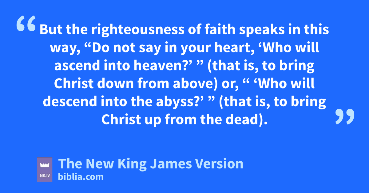5 For Moses writes about the righteousness which is of the law, e“The man who does those things shall live by them.” 6 But the righteousness of faith speaks in this way, f“Do not say in your heart, ‘Who will ascend into heaven?’ ” (that is, to bring Christ down from above) 7 or, g“ ‘Who will descend into the abyss?’ ” (that is, to bring Christ up from the dead). 8 But what does it say? h“The word is near you, in your mouth and in your heart” (that is, the word of faith which we preach): 9 that iif you confess with your mouth the Lord Jesus and believe in your heart that God has raised Him from the dead, you will be saved. 10 For with the heart one believes unto righteousness, and with the mouth confession is made unto salvation. 11 For the Scripture says, j“Whoever believes on Him will not be put to shame.” 12 For kthere is no distinction between Jew and Greek, for lthe same Lord over all mis rich to all who call upon Him. 13 For n“whoever calls oon the name of the Lord shall be saved.”