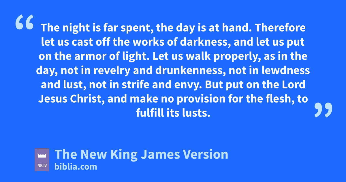 11 And do this, knowing the time, that now it is high time kto awake out of sleep; for now our salvation is nearer than when we first believed. 12 The night is far spent, the day is at hand. lTherefore let us cast off the works of darkness, and mlet us put on the armor of light. 13 nLet us walk 3properly, as in the day, onot in revelry and drunkenness, pnot in lewdness and lust, qnot in strife and envy. 14 But rput on the Lord Jesus Christ, and smake no provision for the flesh, to fulfill its lusts.