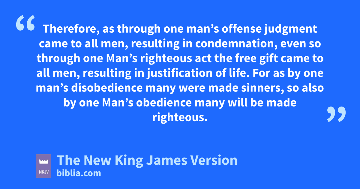12 Therefore, just as sthrough one man sin entered the world, and tdeath through sin, and thus death spread to all men, because all sinned—13 (For until the law sin was in the world, but usin is not imputed when there is no law. 14 Nevertheless death reigned from Adam to Moses, even over those who had not sinned according to the likeness of the transgression of Adam, vwho is a type of Him who was to come. 15 But the free gift is not like the 5offense. For if by the one man’s offense many died, much more the grace of God and the gift by the grace of the one Man, Jesus Christ, abounded wto many. 16 And the gift is not like that which came through the one who sinned. For the judgment which came from one offense resulted in condemnation, but the free gift which came from many 6offenses resulted in justification. 17 For if by the one man’s 7offense death reigned through the one, much more those who receive abundance of grace and of the gift of righteousness will reign in life through the One, Jesus Christ.)