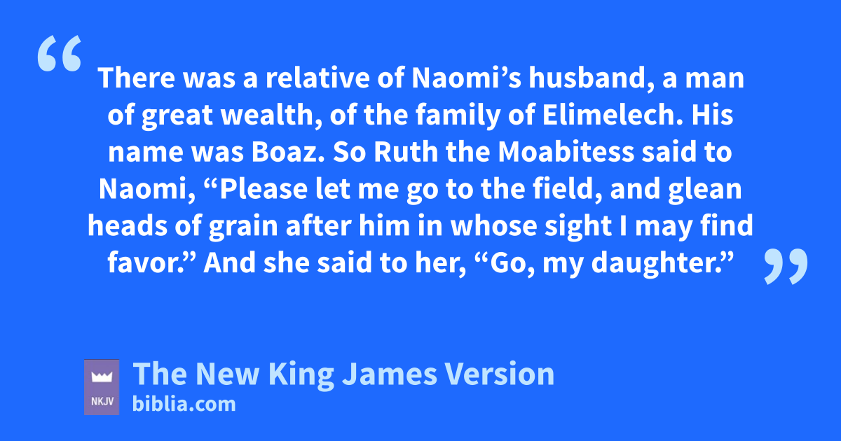2 There was a arelative of Naomi’s husband, a man of great wealth, of the family of bElimelech. His name was cBoaz. 2 So Ruth the Moabitess said to Naomi, “Please let me go to the dfield, and glean heads of grain after him in whose sight I may find favor.”