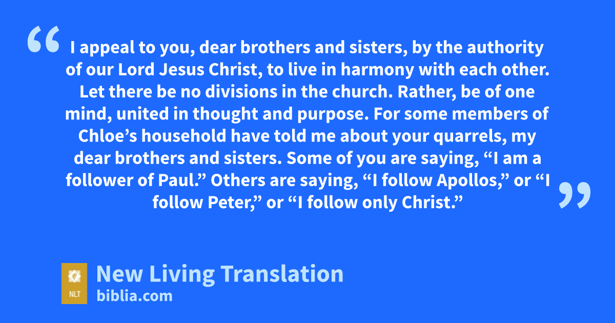 10 I appeal to you, dear brothers and sisters,* by the authority of our Lord Jesus Christ, to live in harmony with each other. Let there be no divisions in the church. Rather, be of one mind, united in thought and purpose. 11 For some members of Chloe’s household have told me about your quarrels, my dear brothers and sisters. 12 Some of you are saying, “I am a follower of Paul.” Others are saying, “I follow Apollos,” or “I follow Peter,* ” or “I follow only Christ.”