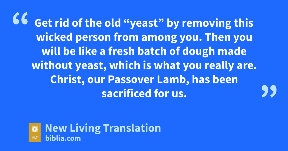 6 Your boasting about this is terrible. Don’t you realize that this sin is like a little yeast that spreads through the whole batch of dough? 7 Get rid of the old “yeast” by removing this wicked person from among you. Then you will be like a fresh batch of dough made without yeast, which is what you really are. Christ, our Passover Lamb, has been sacrificed for us.* 8 So let us celebrate the festival, not with the old bread* of wickedness and evil, but with the new bread* of sincerity and truth.