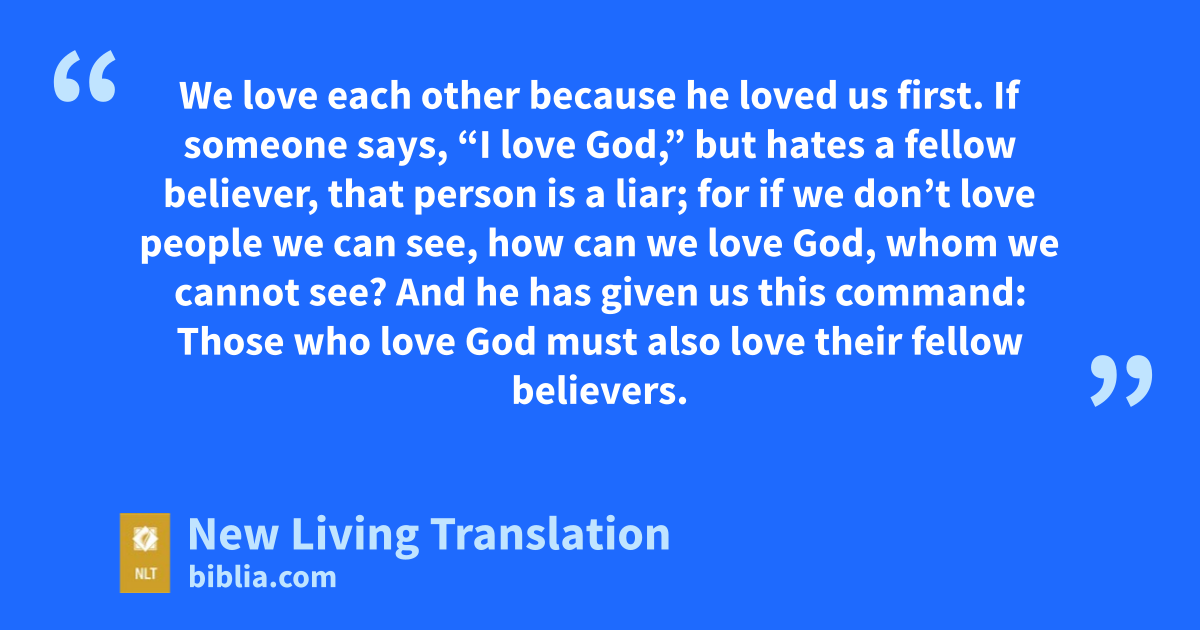 20 If someone says, “I love God,” but hates a fellow believer,* that person is a liar; for if we don’t love people we can see, how can we love God, whom we cannot see? 21 And he has given us this command: Those who love God must also love their fellow believers.*