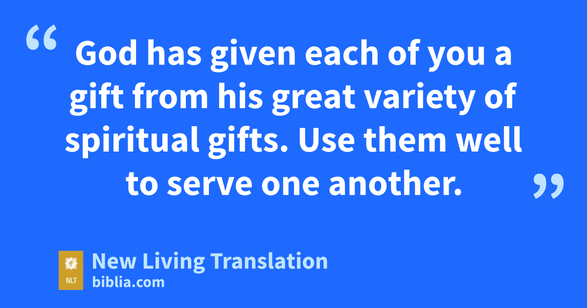10 God has given each of you a gift from his great variety of spiritual gifts. Use them well to serve one another. 11 Do you have the gift of speaking? Then speak as though God himself were speaking through you. Do you have the gift of helping others? Do it with all the strength and energy that God supplies. Then everything you do will bring glory to God through Jesus Christ. All glory and power to him forever and ever! Amen.