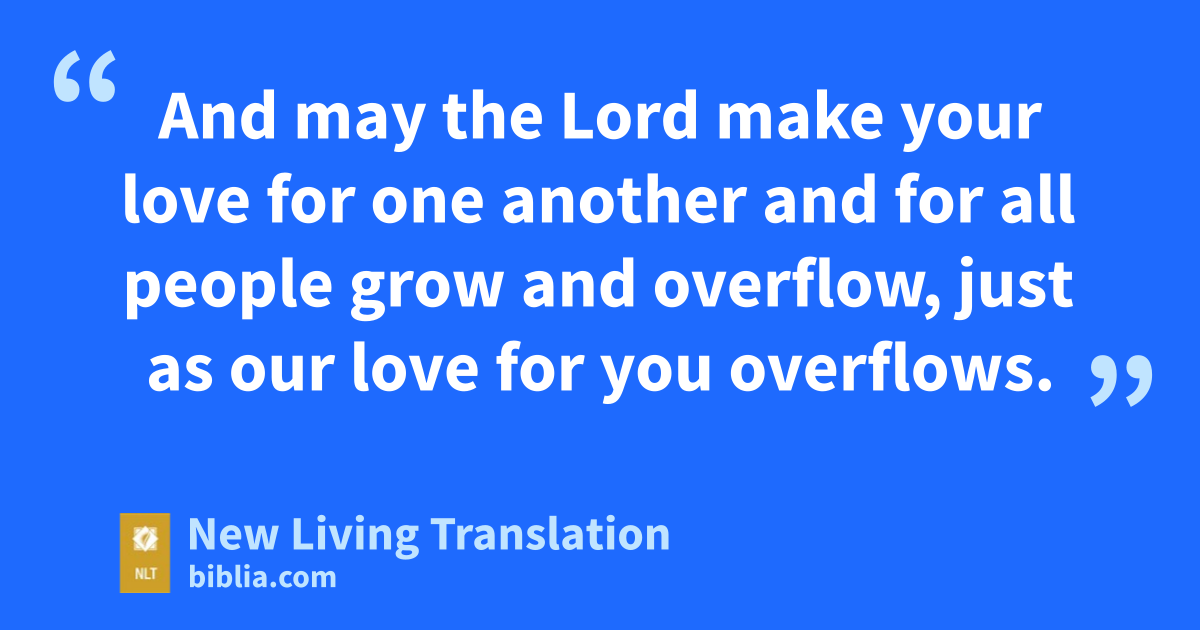 11 May God our Father and our Lord Jesus bring us to you very soon. 12 And may the Lord make your love for one another and for all people grow and overflow, just as our love for you overflows. 13 May he, as a result, make your hearts strong, blameless, and holy as you stand before God our Father when our Lord Jesus comes again with all his holy people. Amen.