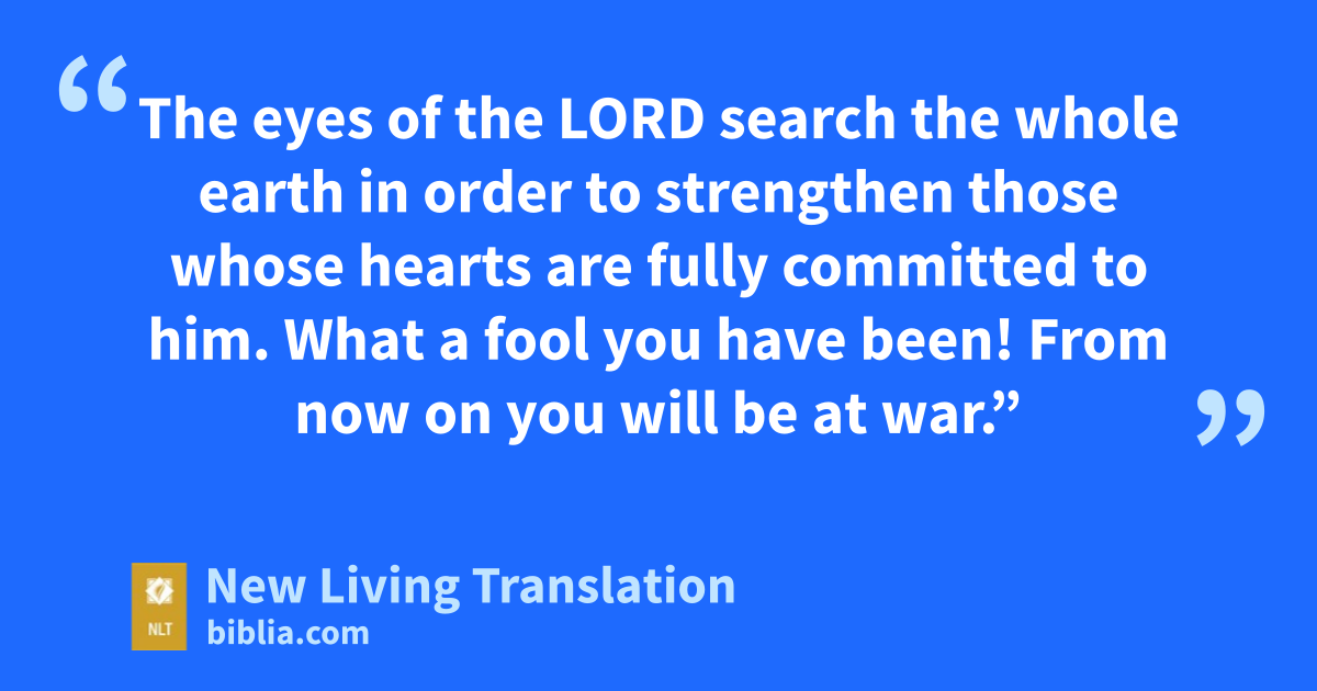 7 At that time Hanani the seer came to King Asa and told him, “Because you have put your trust in the king of Aram instead of in the Lord your God, you missed your chance to destroy the army of the king of Aram. 8 Don’t you remember what happened to the Ethiopians* and Libyans and their vast army, with all of their chariots and charioteers?* At that time you relied on the Lord, and he handed them over to you. 9 The eyes of the Lord search the whole earth in order to strengthen those whose hearts are fully committed to him. What a fool you have been! From now on you will be at war.”