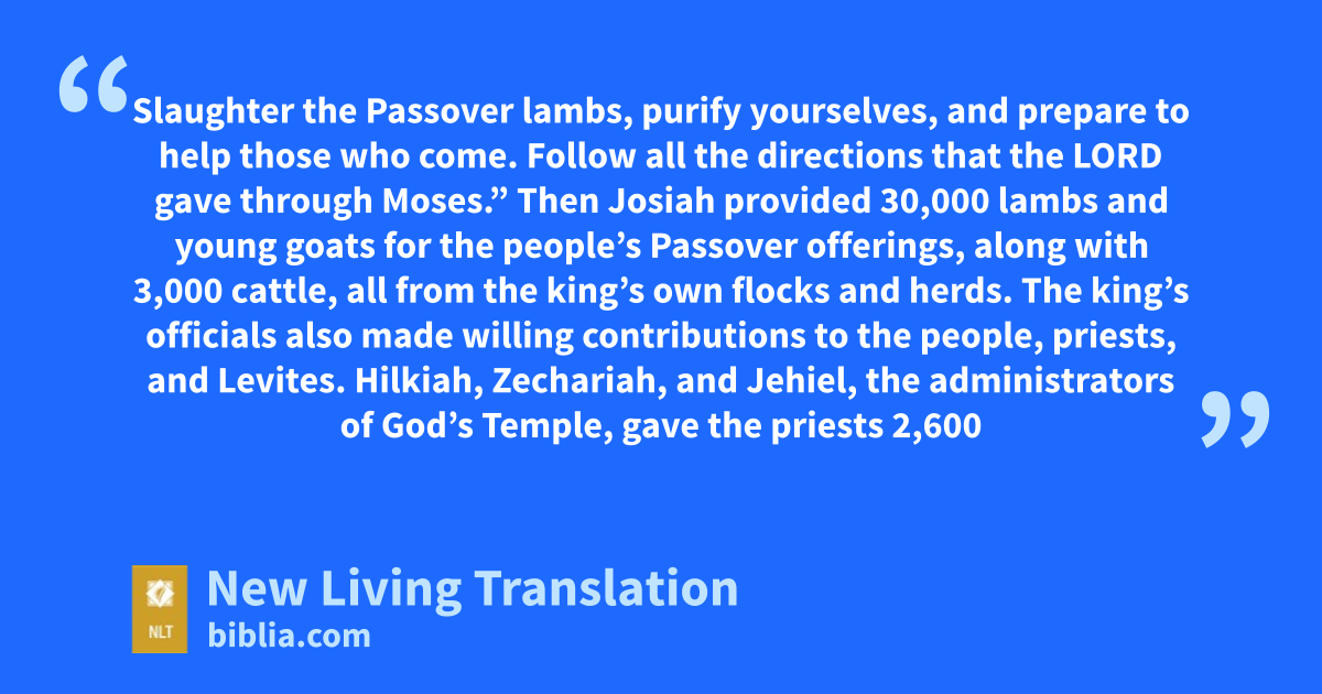 7 Then Josiah provided 30,000 lambs and young goats for the people’s Passover offerings, along with 3,000 cattle, all from the king’s own flocks and herds. 8 The king’s officials also made willing contributions to the people, priests, and Levites. Hilkiah, Zechariah, and Jehiel, the administrators of God’s Temple, gave the priests 2,600 lambs and young goats and 300 cattle as Passover offerings. 9 The Levite leaders—Conaniah and his brothers Shemaiah and Nethanel, as well as Hashabiah, Jeiel, and Jozabad—gave 5,000 lambs and young goats and 500 cattle to the Levites for their Passover offerings.
