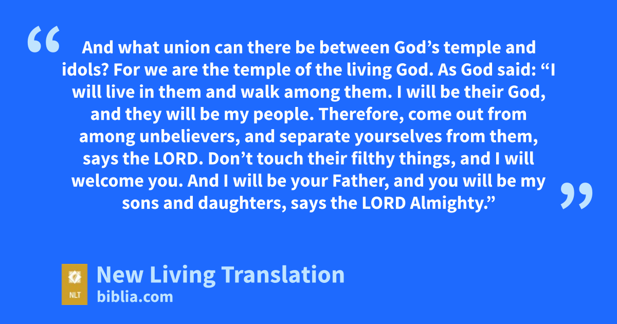 14 Don’t team up with those who are unbelievers. How can righteousness be a partner with wickedness? How can light live with darkness? 15 What harmony can there be between Christ and the devil* ? How can a believer be a partner with an unbeliever? 16 And what union can there be between God’s temple and idols? For we are the temple of the living God. As God said: