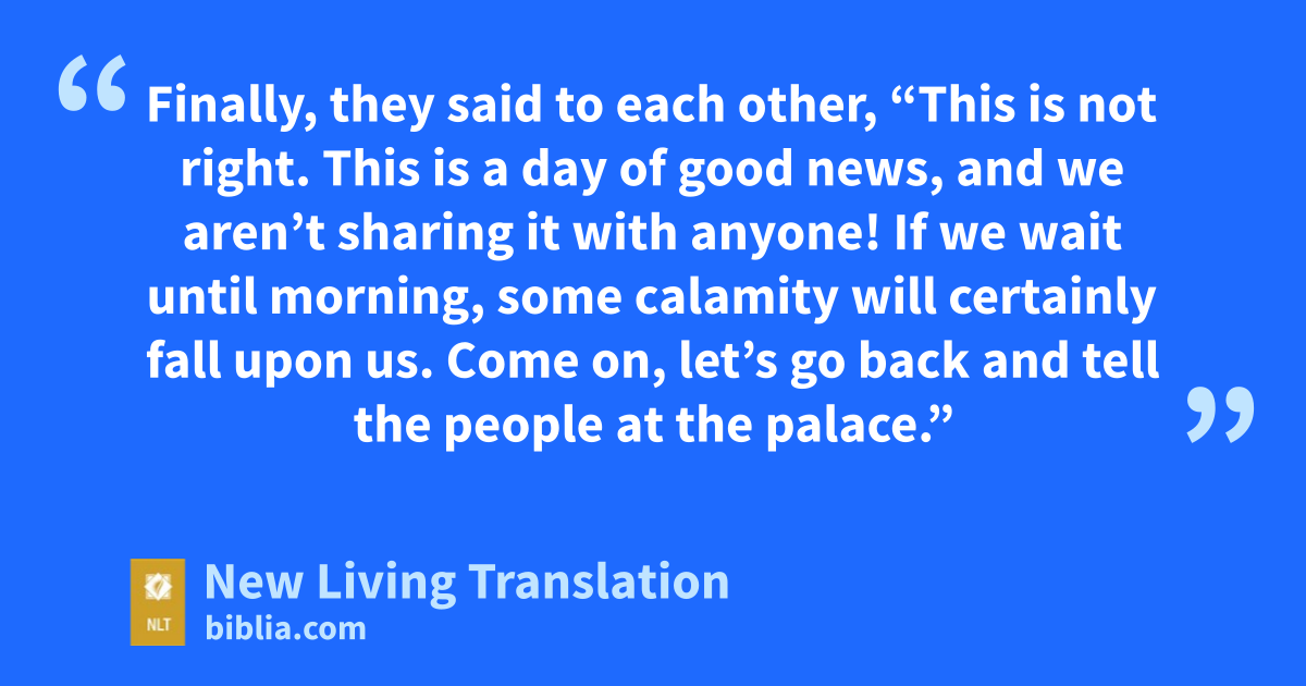 8 When the men with leprosy arrived at the edge of the camp, they went into one tent after another, eating and drinking wine; and they carried off silver and gold and clothing and hid it. 9 Finally, they said to each other, “This is not right. This is a day of good news, and we aren’t sharing it with anyone! If we wait until morning, some calamity will certainly fall upon us. Come on, let’s go back and tell the people at the palace.”