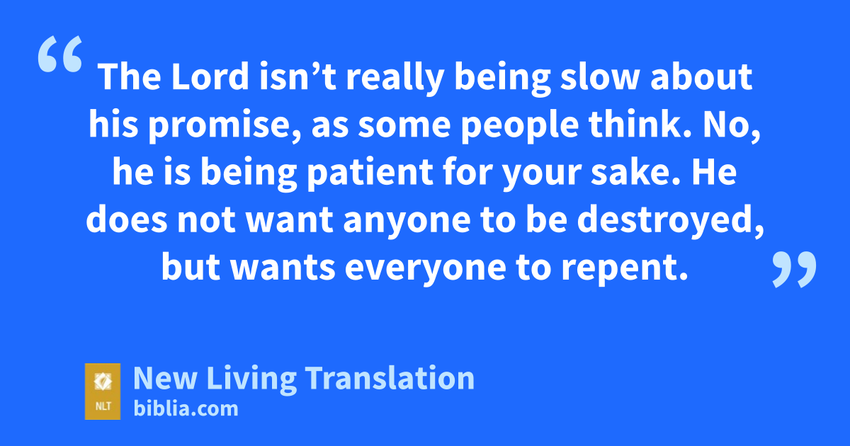 8 But you must not forget this one thing, dear friends: A day is like a thousand years to the Lord, and a thousand years is like a day. 9 The Lord isn’t really being slow about his promise, as some people think. No, he is being patient for your sake. He does not want anyone to be destroyed, but wants everyone to repent. 10 But the day of the Lord will come as unexpectedly as a thief. Then the heavens will pass away with a terrible noise, and the very elements themselves will disappear in fire, and the earth and everything on it will be found to deserve judgment.*