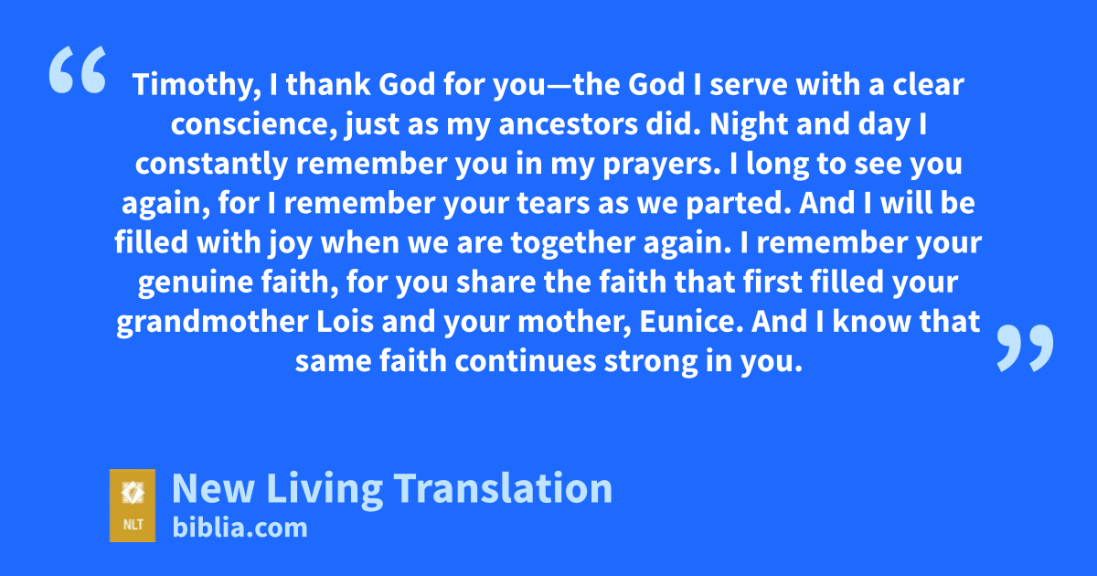 3 Timothy, I thank God for you—the God I serve with a clear conscience, just as my ancestors did. Night and day I constantly remember you in my prayers. 4 I long to see you again, for I remember your tears as we parted. And I will be filled with joy when we are together again.