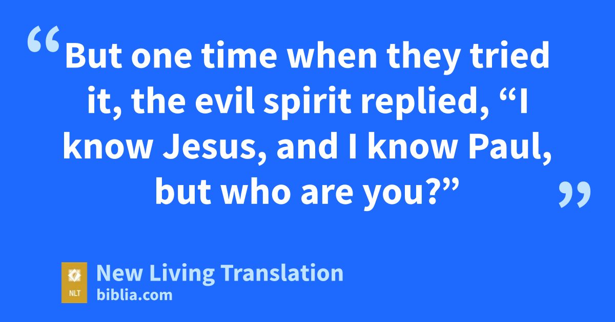 13 A group of Jews was traveling from town to town casting out evil spirits. They tried to use the name of the Lord Jesus in their incantation, saying, “I command you in the name of Jesus, whom Paul preaches, to come out!” 14 Seven sons of Sceva, a leading priest, were doing this. 15 But one time when they tried it, the evil spirit replied, “I know Jesus, and I know Paul, but who are you?” 16 Then the man with the evil spirit leaped on them, overpowered them, and attacked them with such violence that they fled from the house, naked and battered.