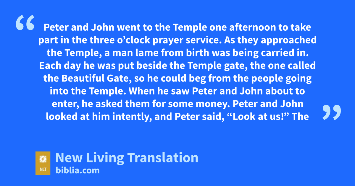 Peter and John went to the Temple one afternoon to take part in the three o’clock prayer service. 2 As they approached the Temple, a man lame from birth was being carried in. Each day he was put beside the Temple gate, the one called the Beautiful Gate, so he could beg from the people going into the Temple. 3 When he saw Peter and John about to enter, he asked them for some money.