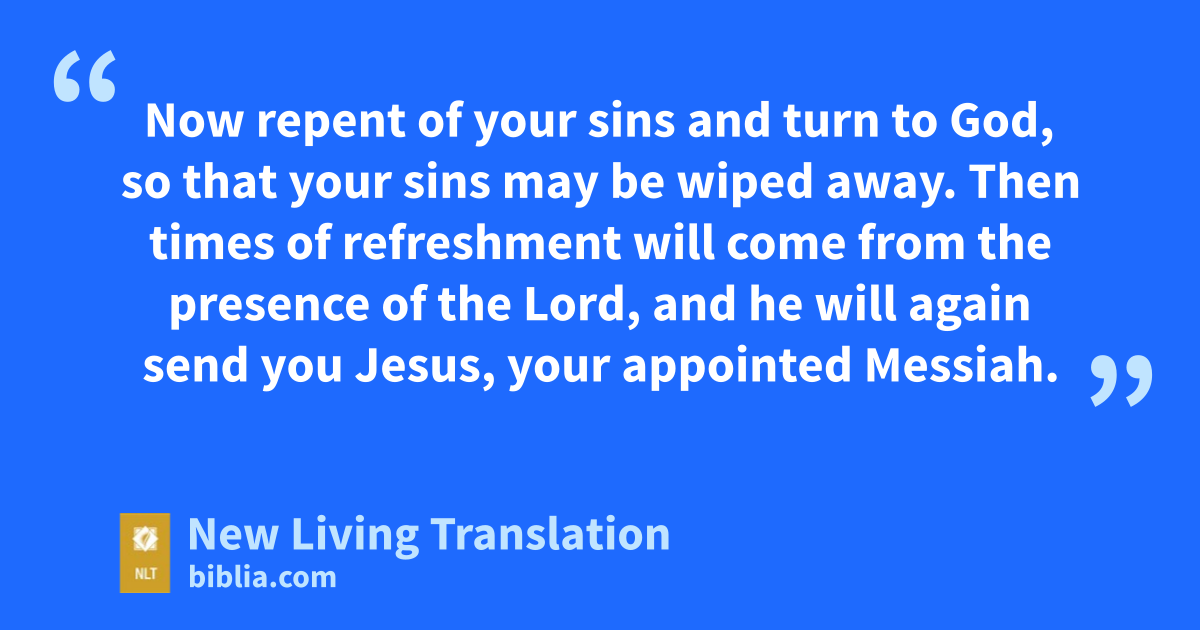 17 “Friends,* I realize that what you and your leaders did to Jesus was done in ignorance. 18 But God was fulfilling what all the prophets had foretold about the Messiah—that he must suffer these things. 19 Now repent of your sins and turn to God, so that your sins may be wiped away. 20 Then times of refreshment will come from the presence of the Lord, and he will again send you Jesus, your appointed Messiah. 21 For he must remain in heaven until the time for the final restoration of all things, as God promised long ago through his holy prophets. 22 Moses said, ‘The Lord your God will raise up for you a Prophet like me from among your own people. Listen carefully to everything he tells you.’* 23 Then Moses said, ‘Anyone who will not listen to that Prophet will be completely cut off from God’s people.’*