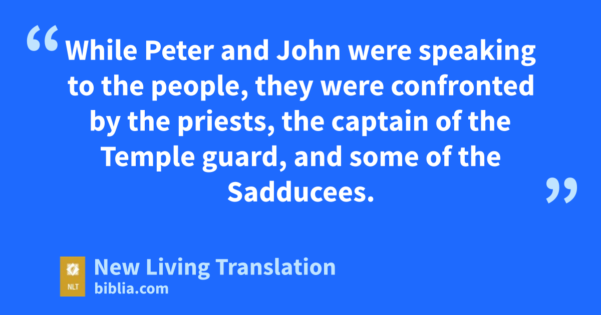 While Peter and John were speaking to the people, they were confronted by the priests, the captain of the Temple guard, and some of the Sadducees. 2 These leaders were very disturbed that Peter and John were teaching the people that through Jesus there is a resurrection of the dead. 3 They arrested them and, since it was already evening, put them in jail until morning. 4 But many of the people who heard their message believed it, so the number of men who believed now totaled about 5,000.