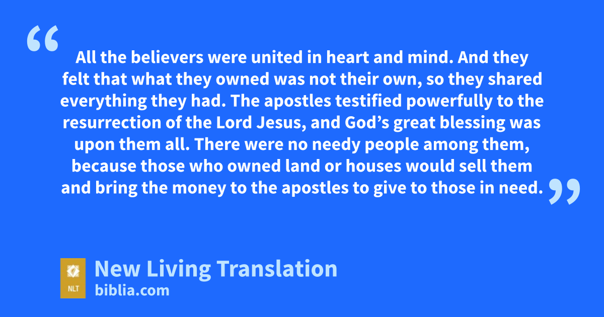 32 All the believers were united in heart and mind. And they felt that what they owned was not their own, so they shared everything they had. 33 The apostles testified powerfully to the resurrection of the Lord Jesus, and God’s great blessing was upon them all. 34 There were no needy people among them, because those who owned land or houses would sell them 35 and bring the money to the apostles to give to those in need.
