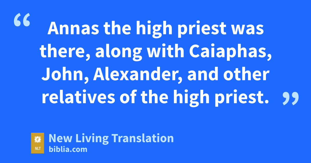 5 The next day the council of all the rulers and elders and teachers of religious law met in Jerusalem. 6 Annas the high priest was there, along with Caiaphas, John, Alexander, and other relatives of the high priest. 7 They brought in the two disciples and demanded, “By what power, or in whose name, have you done this?”